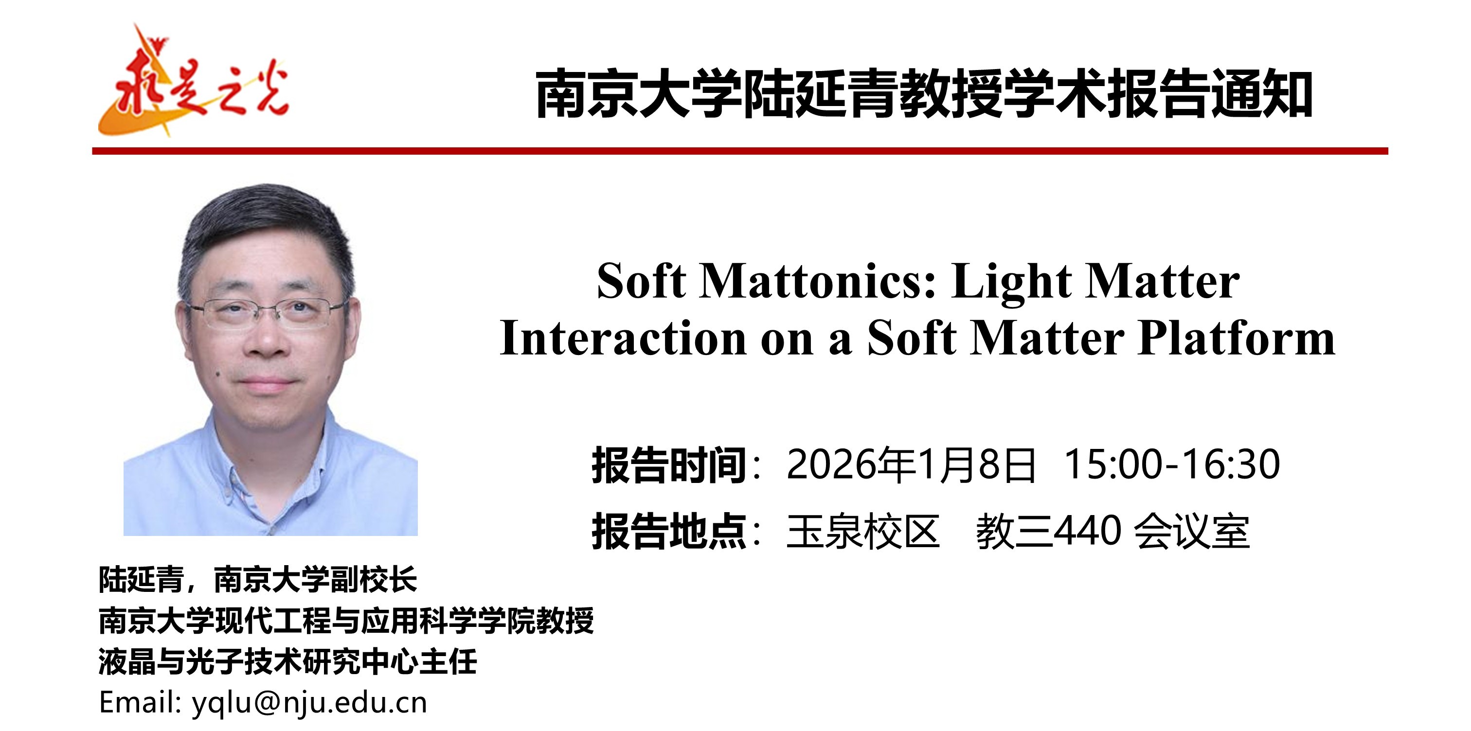 2026年1月8日,南京大学副校长陆延青教授来访并作题为 “Soft mattonics: light matter interaction on a soft matter platform” 的学术报告。